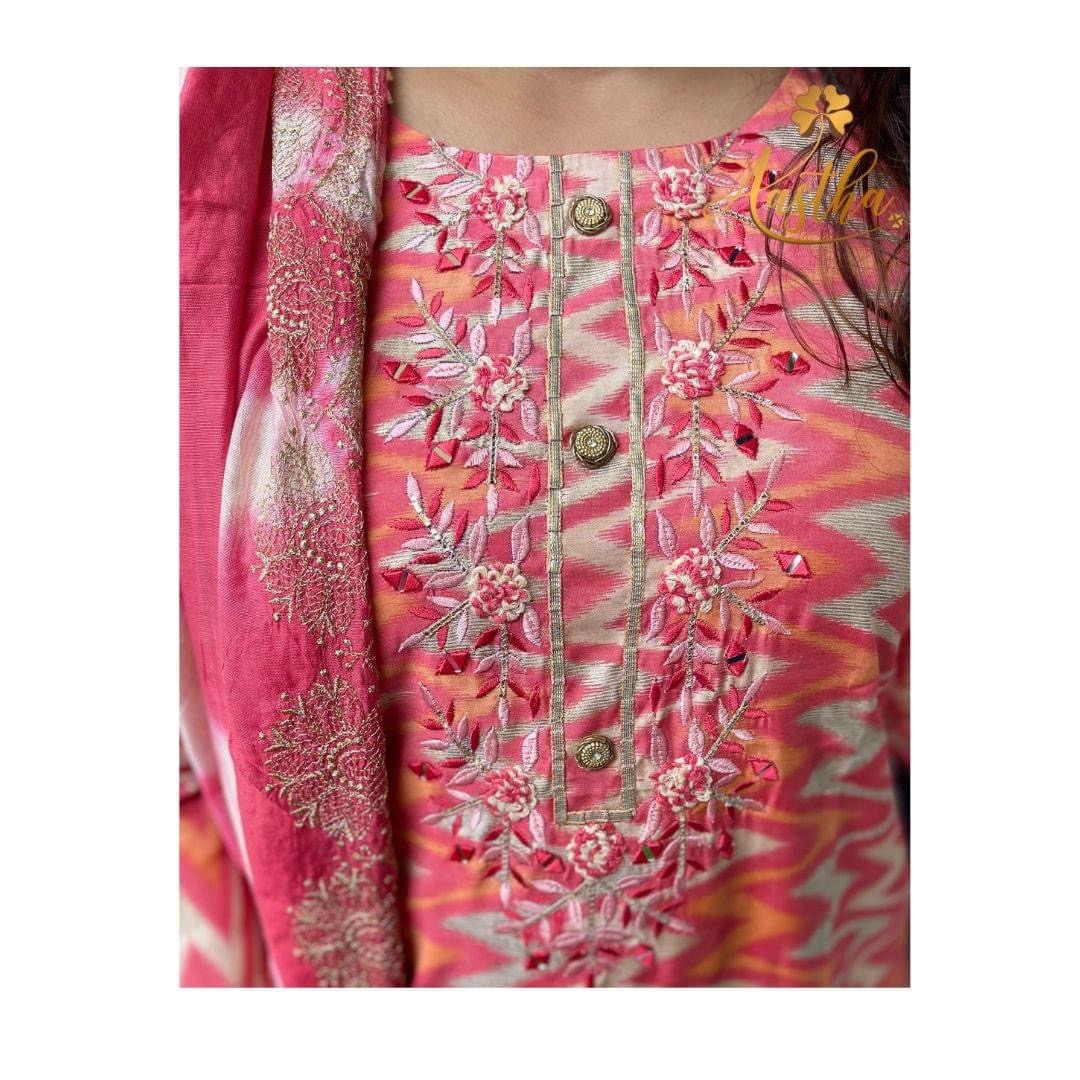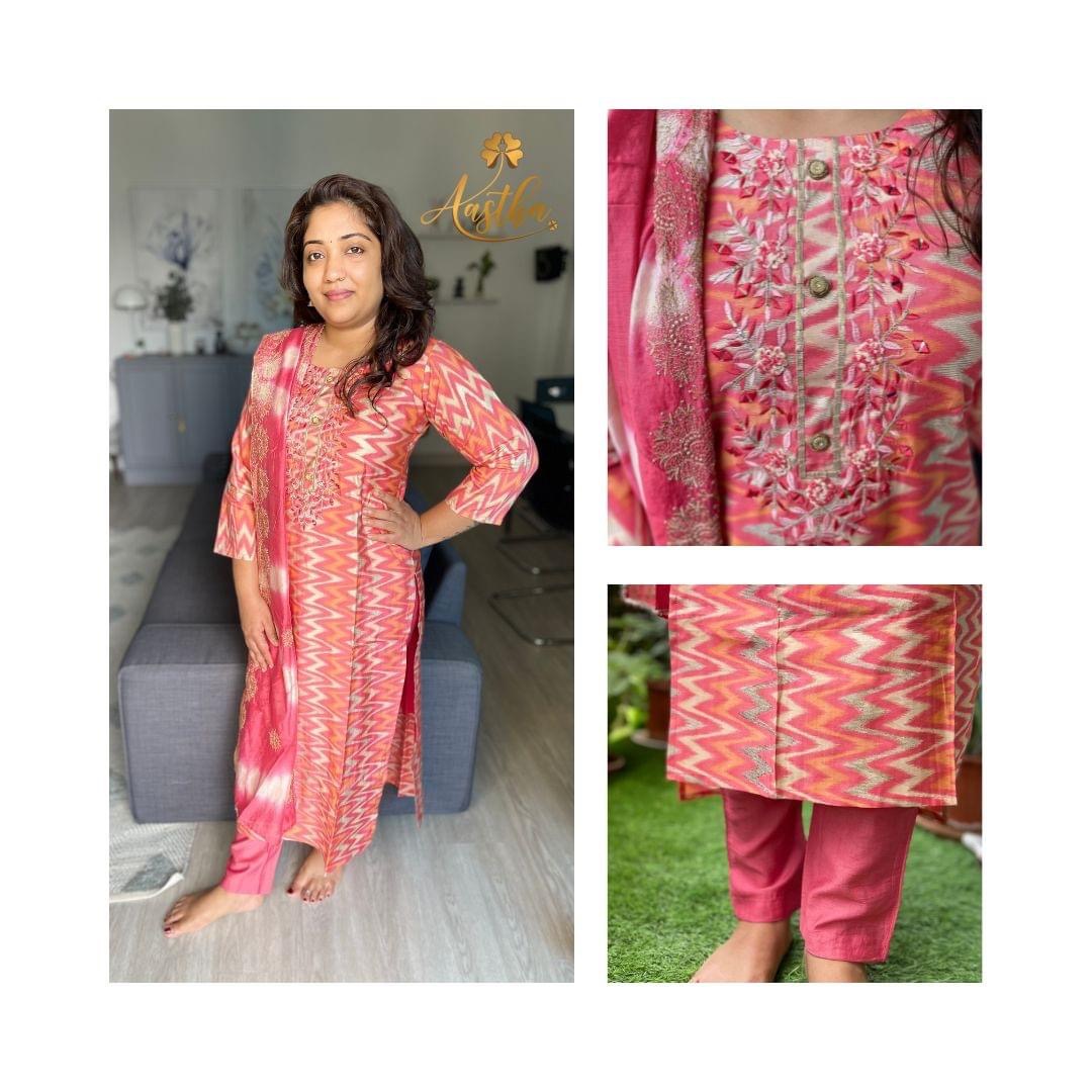 Get this lovely zig-zag printed straight cut Muslin Suit Set with French knot embroidery and thread work on the yoke, paired with a handwoven silk dupatta and muslin pants!